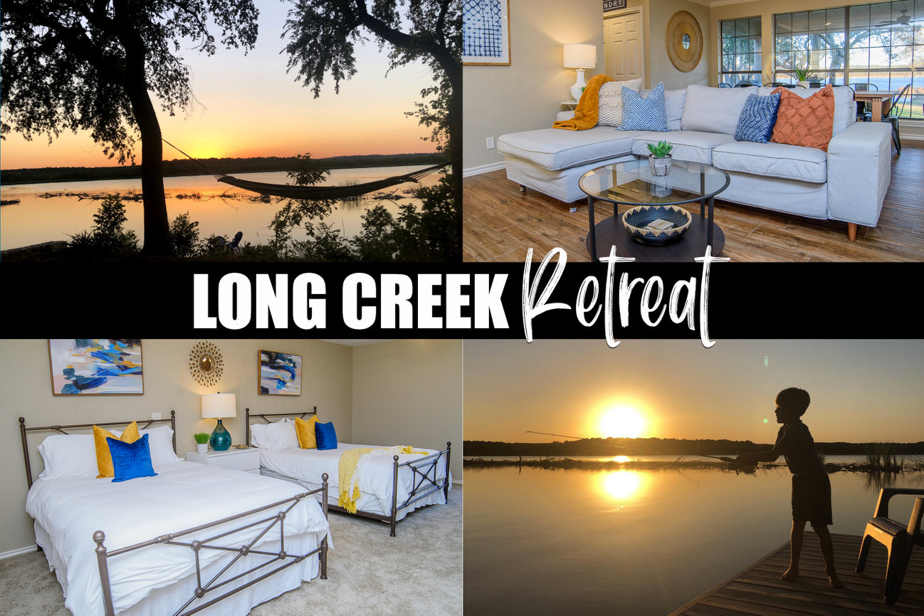 We are located on Long Creek off the Brazos River and Lake Granbury. We are currently in a drought and water levels are low and subject to change. Please check here for current water levels. Anything below 95% and you will not be able to get in smaller boats or a pontoon in at our ramp. At 90%, the water is down 12-18 inches. At 85% and below, the water will be down 2-3 feet and is extremely shallow around our dock and you may have to wade out a little bit with the paddle boards and kayak to get to deeper water. Deeper water is the left and there are PVC pines marking the deeper water area to the Brazos River to the right or Lake Granbury to the left once you get out of our cove.